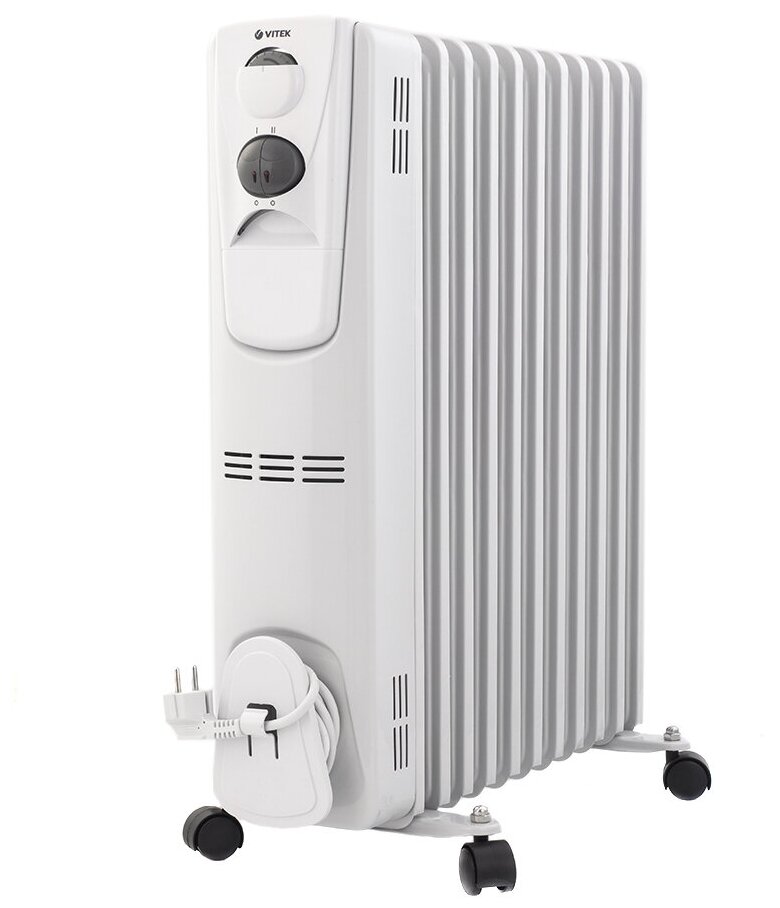 Лучшие цены. Масляный радиатор Vitek VT-2128 W имеет классический для таких аппаратов дизайн, а именно крупный секционный корпус, установленный на ножках с колесиками. На передней панели находятся все элементы управления, световые индикаторы, а также шнур питания с отделением для удобного хранения. Одиннадцать секций обеспечивают этой модели высокую мощность. На корпусе есть ручка для удобного перемещения, которая позволяет с легкостью ставить прибор в нужное место. Магазины в вашем городе.
