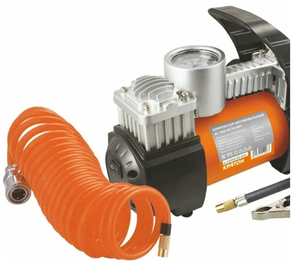 Лучшие цены. Автомобильный компрессор Кратон AC30010/70DDV отличается небольшими габаритами и весом, что обеспечивает удобство хранения и транспортировки. Способ соединения с сетью эл.питания: зажимы кабеля электропитания компрессора к полюсным выводам аккумуляторной батареи автотранспортного средства. Устройство отличается высокой производительностью. Агрегат оснащается шлангом спиральным PU, авт. системой защиты от перегрева. Поставляется в комплекте с набором дополнительных штуцеров и удобной сумкой для хранения. Магазины в вашем городе.