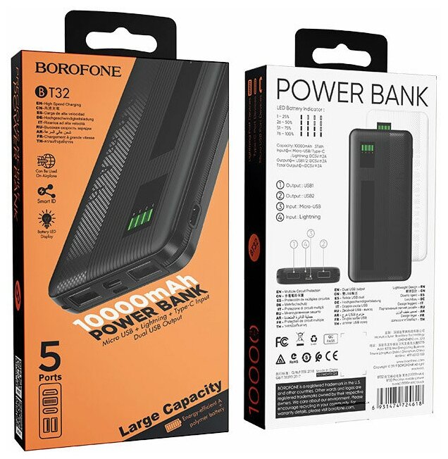 Портативный аккумулятор Borofone BT32 Precious 10000mAh, вх.: Micro-USB/USB-C/Lightning, вых.: 2xUSB-Af, LED, чёрный