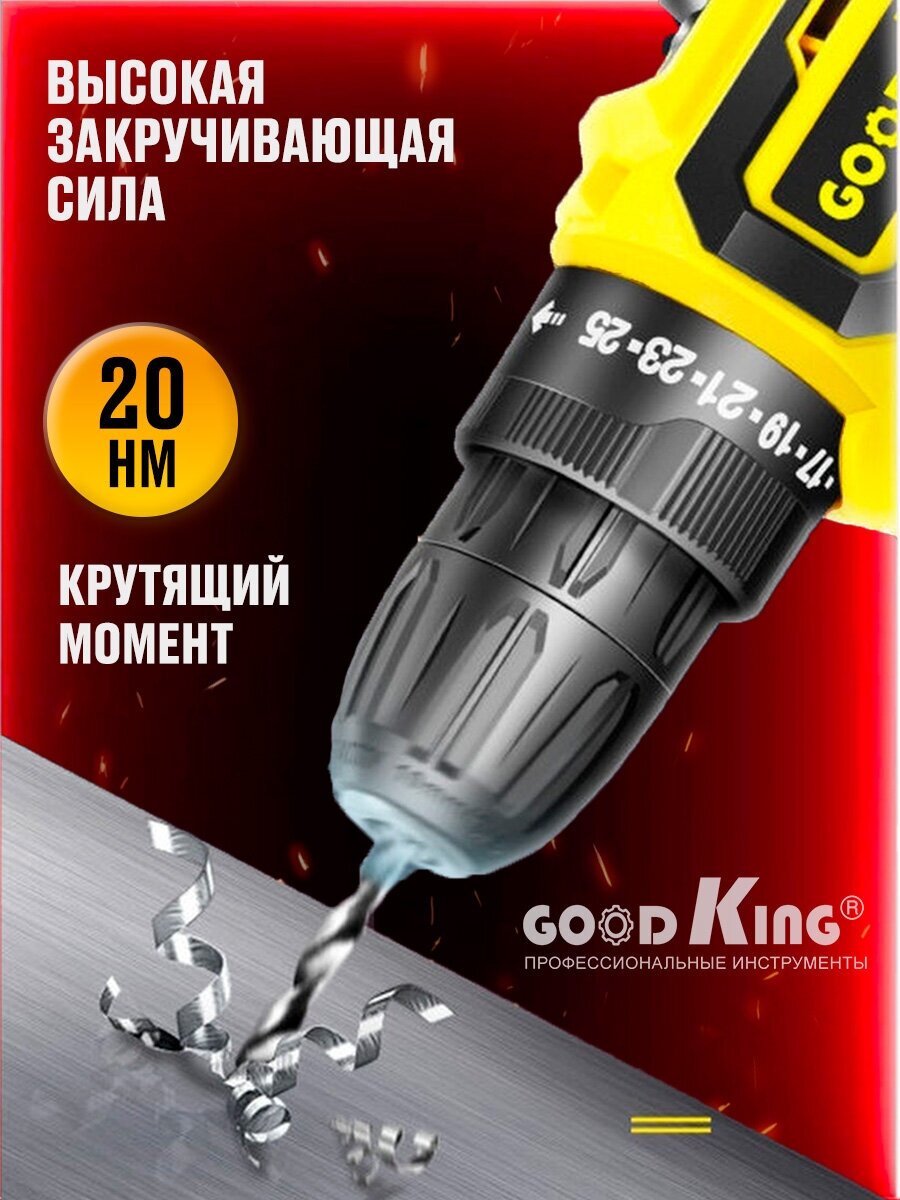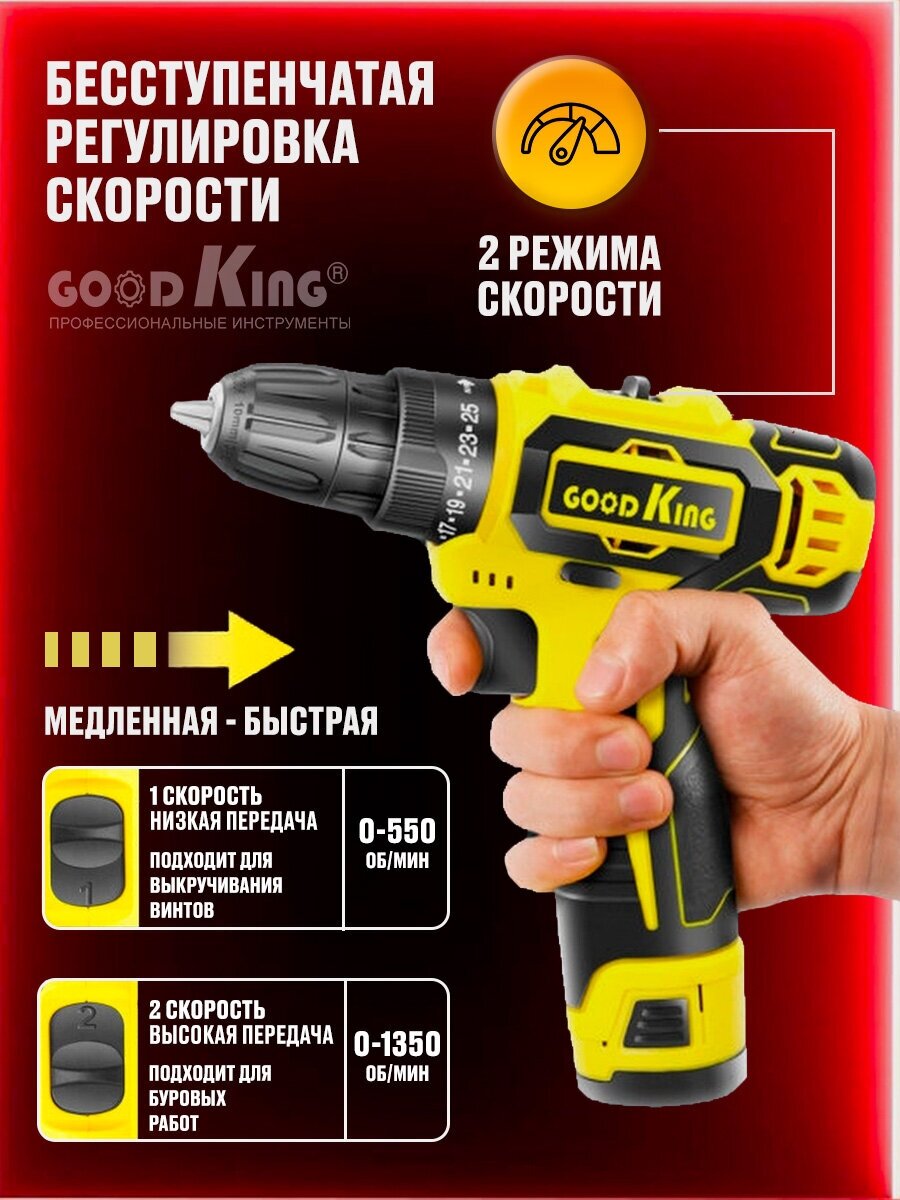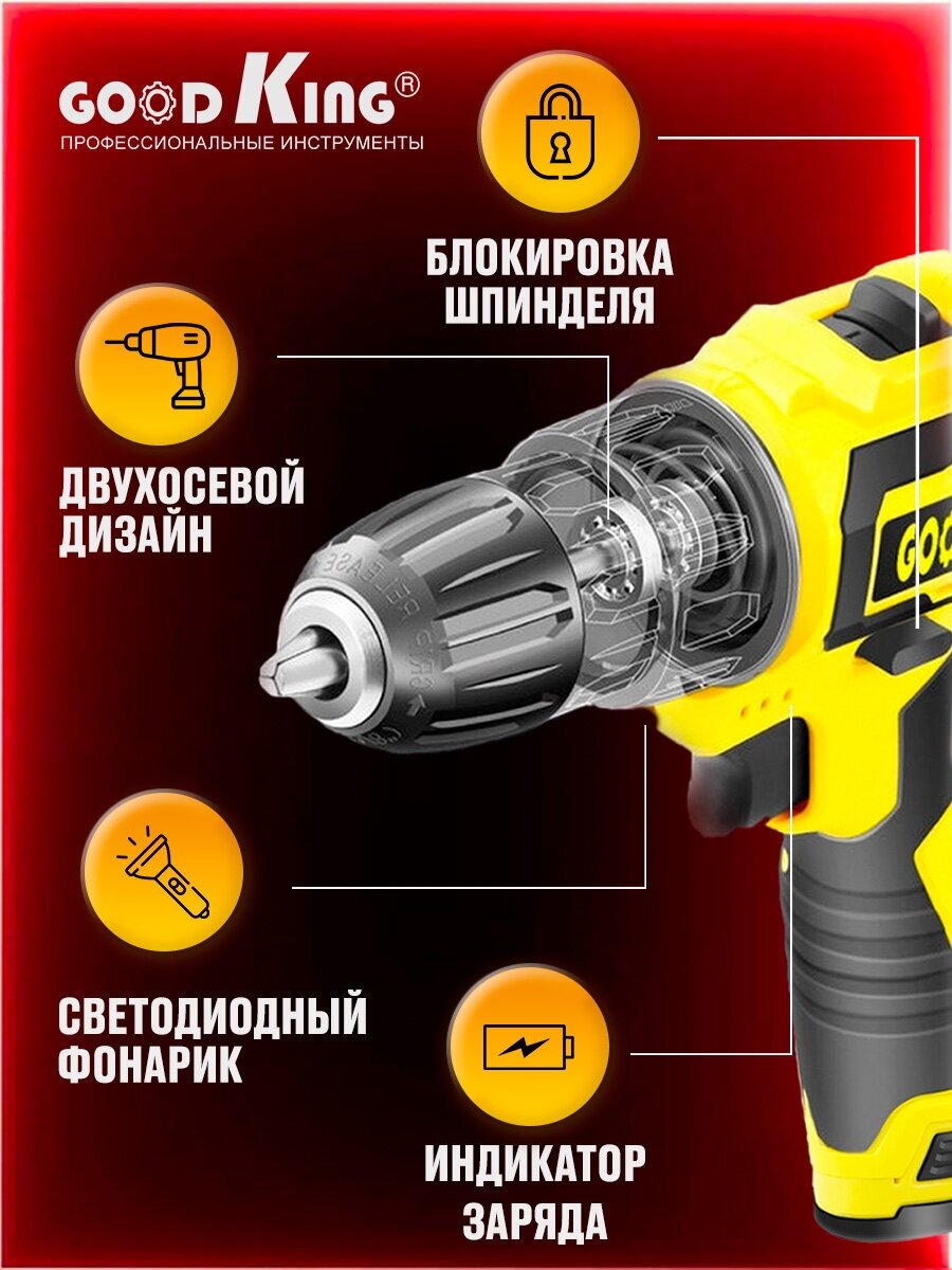 Лучшие цены. Шуруповерт аккумуляторный GOOKDKING YL-101201 — это базовый инструмент, который пригодится в каждом доме. С его помощью Вы можете выполнить любые стандартные работы по дому: закрутить и выкрутить шурупы, просверлить отверстия в любом материале, починить и установить мебель. Для самой комфортной работы аккумуляторный шуруповерт станет отличным решением. Дрель-шуруповерт для дома от GOOKDKING — это многофункциональный современный инструмент с массой достоинств. Магазины в вашем городе.