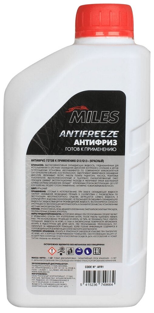 Охлаждающая жидкость Антифриз MILES AFR1 G12/G12+ красный 1 кг готовый