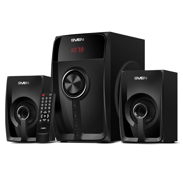 Лучшие цены. Sven MS-307 - стильная и мощная акустическая система, которая понравится даже взыскательному меломану. Она состоит из двух колонок и сабвуфера. Систему можно подключить к компьютеру, ноутбуку или мультимедийному плееру с помощью кабеля, к мобильному устройству посредством Bluetooth. Также в качестве источников контента можно использовать флешки и карты памяти формата SD/MMC. Колонки и сабвуфер выполнены из дерева. Магазины в вашем городе.