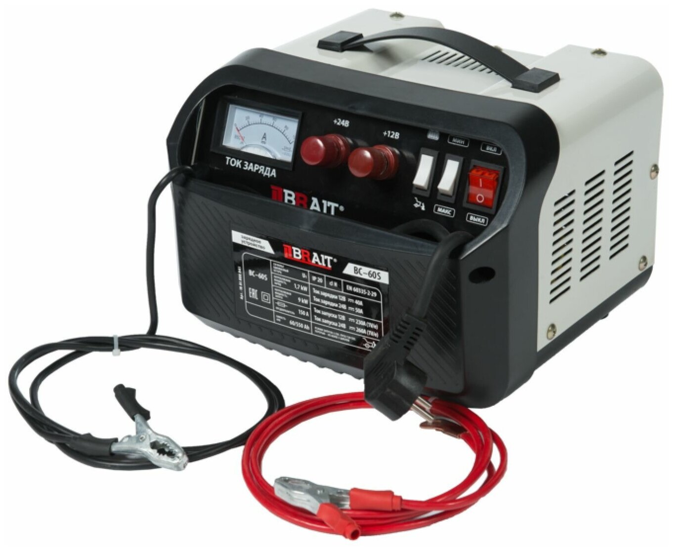Лучшие цены. Пуско-зарядное устройство Brait ВС-60S - традиционное пуско-зарядное устройство, безопасное и надежное, оснащенное защитой от перегрузки и короткого замыкания. Особенности:- заряжает аккумуляторы емкостью до 550 Ач.- возможна работа с аккумуляторами напряжением 12 и 24 В- защита от короткого замыкания- изолированные клеммные зажимы- индикатор зарядного тока- две ступени зарядки - мощность запуска 12/24 В - 4,3 /9 кВт- мощность зарядки 12/24 В - 0,75 / 1,7 кВт- предохранители - 1х80 /1х100 А- рекомендуемая. Магазины в вашем городе.
