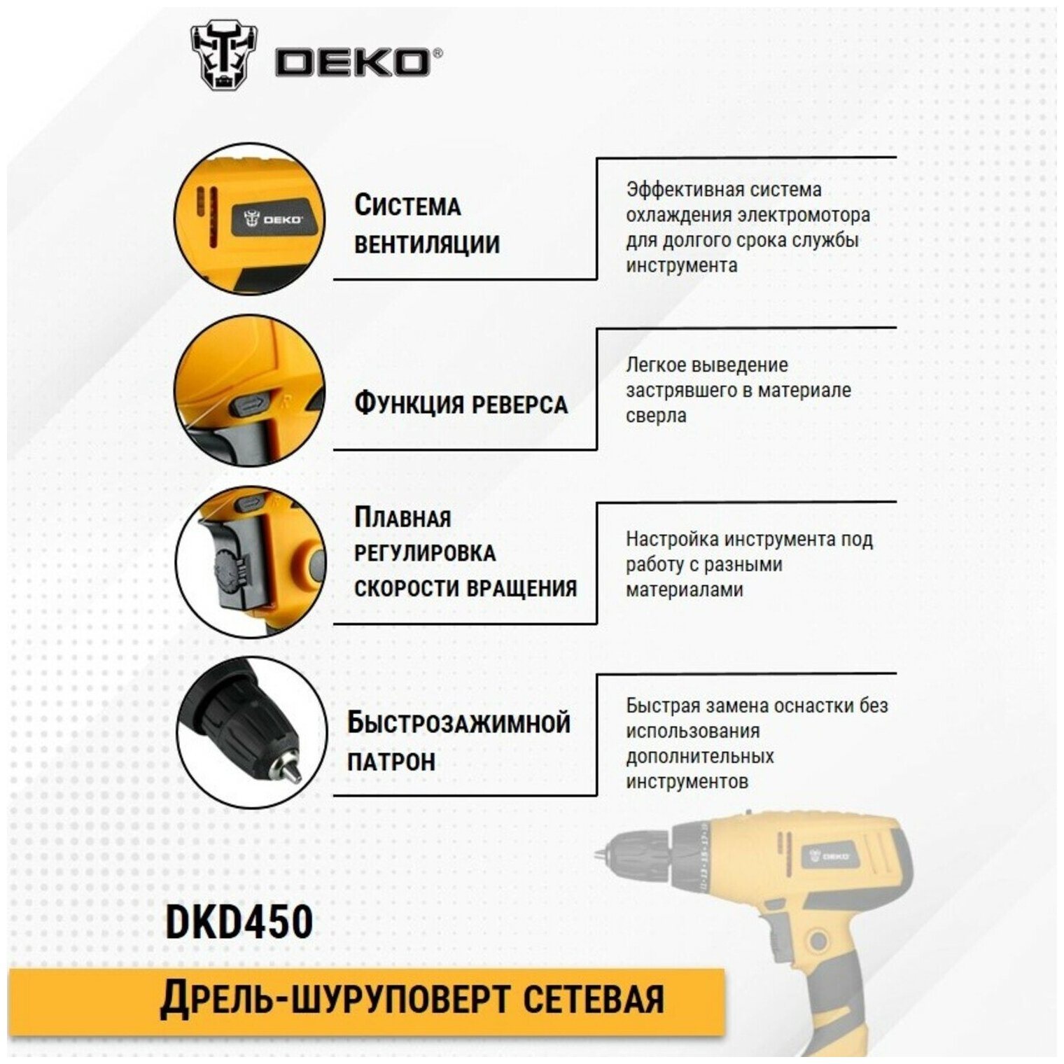 Дрель / шуруповерт Дрель-шуруповёрт сетевая DKD450 450 Вт + набор бит 6 шт. DEKO 063-4281
