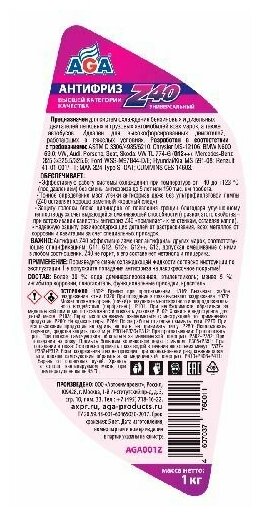 Лучшие цены. Антифриз AGA-Z40/G12++ (AGA001Z/1 кг) Универсальный антифриз. Предназначен для систем охлаждения бензиновых и дизельных двигателей легковых и грузовых автомобилей всех марок, а также автобусов. Идеален для высокофорсированных двигателей, работающих в тяжелых условиях с высокими силовыми нагрузками. Универсальный антифриз. Предназначен для систем охлаждения бензиновых и дизельных двигателей легковых и грузовых автомобилей всех марок, а также автобусов. Магазины в вашем городе.