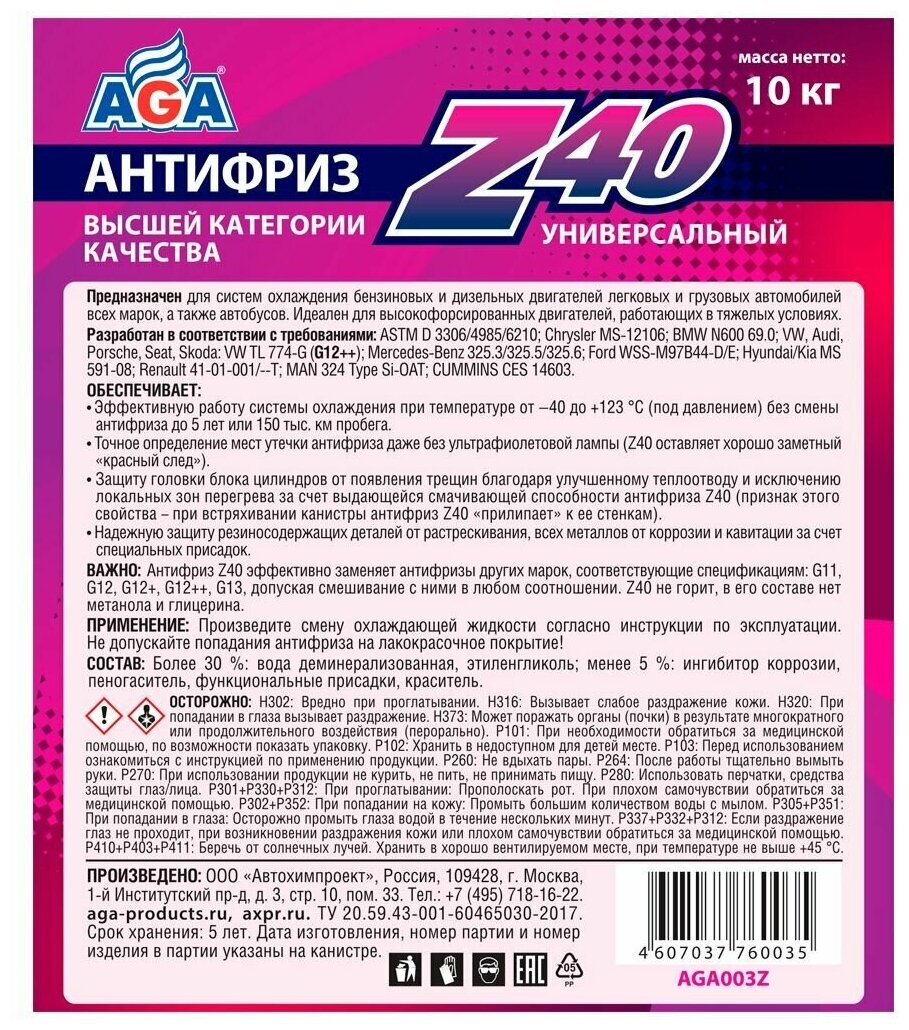 Антифриз AGA Z40 10 л 1 кг 776 ₽ Подробнее