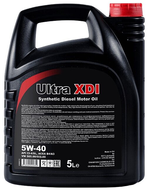 Лучшие цены. Моторное масло 9703 CHEMPIOIL ULTRA XDI, SAE 5W-40, синтетическое, 5 л. Инновационное ester-содержащее полностью синтетическое моторное масло премиум-класса c для современных высокофорсированных турбодизельных двигателей. Разработано в соответствии с требованиями концерна VW. Свойства продукта: - Ester-технология и синтетическая основа с расширенным диапазоном вязкостно-температурных свойств обеспечивает эффективную эксплуатацию двигателя на всех режимах работы: при холодном пуске, в городском режиме, в. Магазины в вашем городе.