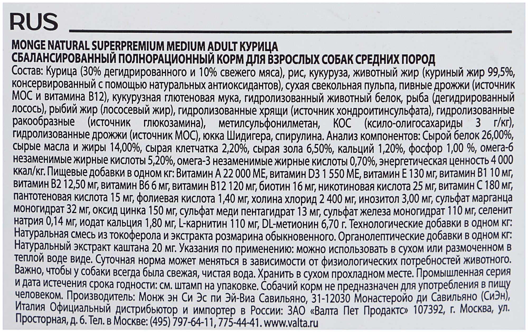 Корм Monge Dog Medium Adult для взрослых собак средних пород, с курицей 12 кг