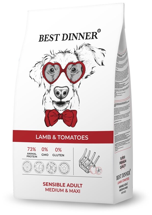 Лучшие цены. Best Dinner Adult Sensible Medium & Maxi Lamb & Tomatoes Производитель: Best Dinner , Россия. Описание: Высококачественный полнорационный корм для собак средних и крупных пород Best Dinner с ягненком и томатами создан специально для собак с особыми потребностями. Томаты - источник холина и каротиноидов. Способствуют профилактике болезней сердца и укрепляют иммунитет. Нежное мясо ягненка обладает отличной усвояемостью и подходит для собак склонных к аллергическим реакциям и проблемами с пищеварением. Магазины в вашем городе.