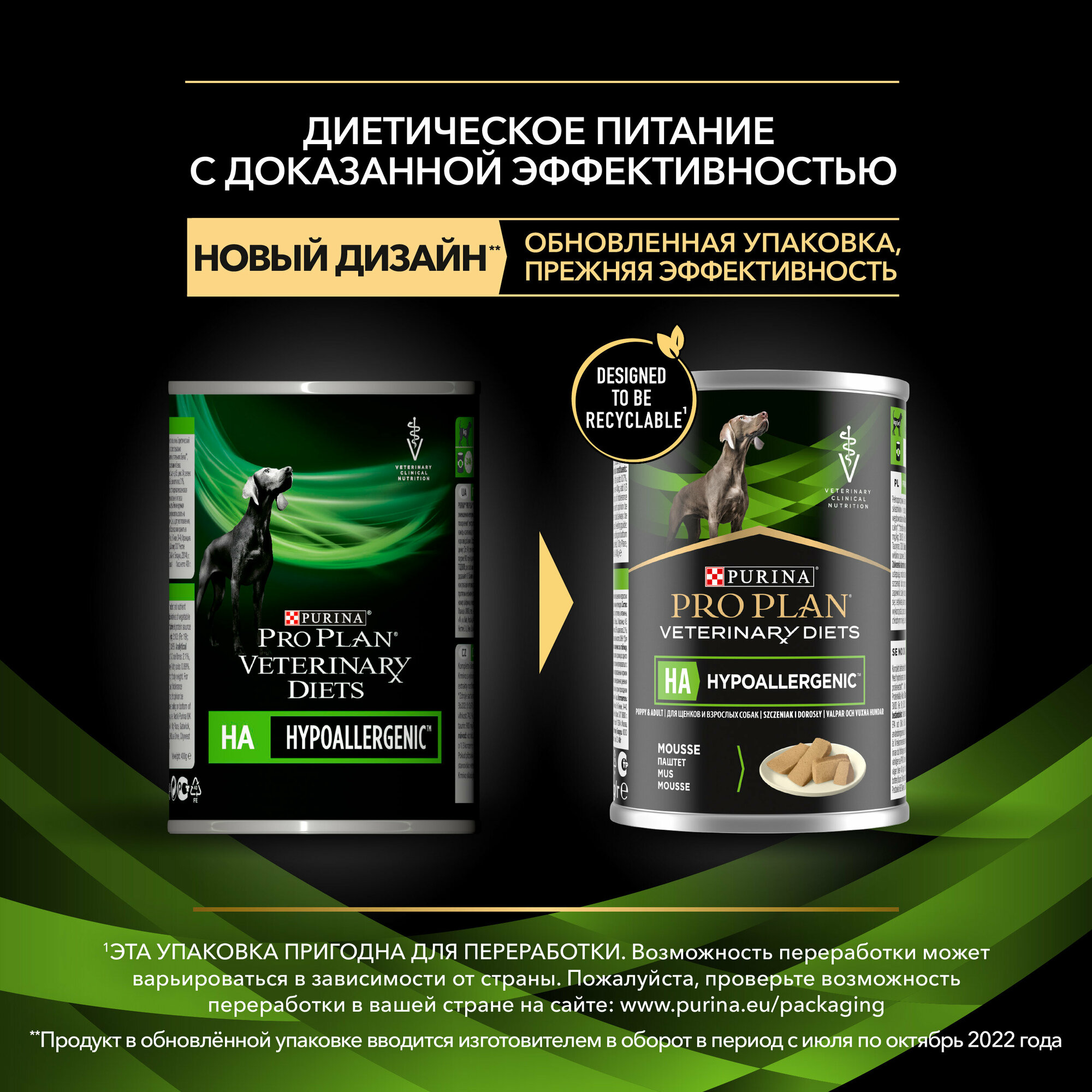 Влажный корм Pro Plan Veterinary Diets HA для щенков и взрослых собак, для снижения непереносимости ингредиентов и питательных веществ, Консерва, 12 шт. х 400 г