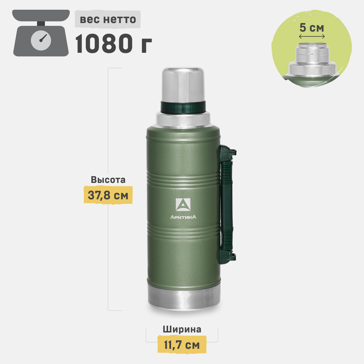 Термос Арктика 106-1250P зелёный с ручкой, 1,25л, 40ч 3 740 ₽ Подробнее