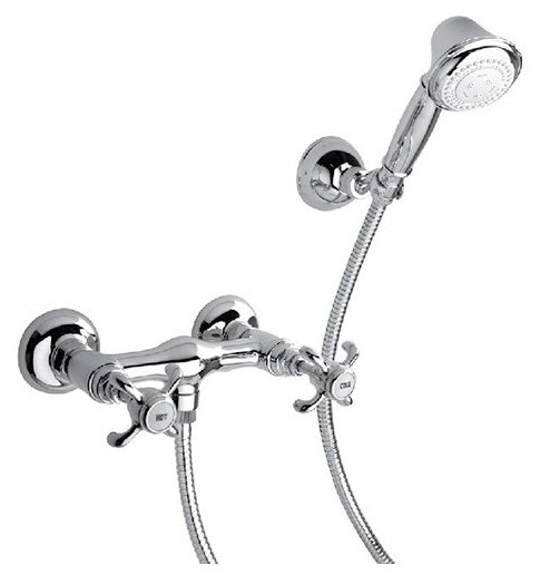 Лучшие цены. Управление: двухвентильное, Цвет: хром, Материал: латунь, Стандарт подводки: 1/2", Монтаж: на стену, Отверстия для монтажа: на 2 отверстия, Стилистика дизайна: ретро, Форма: круглая, Дополнительные функции: лейка + Шланг в комплекте, Встраиваемая система: нет, Поверхность: глянцевая, Область применения: бытовая, Форма излива: излив отсутствует, Механизм: керамическая кран-букса, Ширина, см: 23, Высота, см: 6.85, Глубина, см: 15.8, Оснащение: душевой шланг, душевая лейка, крепления, настенный держатель. Магазины в вашем городе.