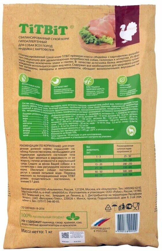 Сухой корм для собак всех пород TiTBiT Гипоаллергенный Индейка с картофелем, 1 кг