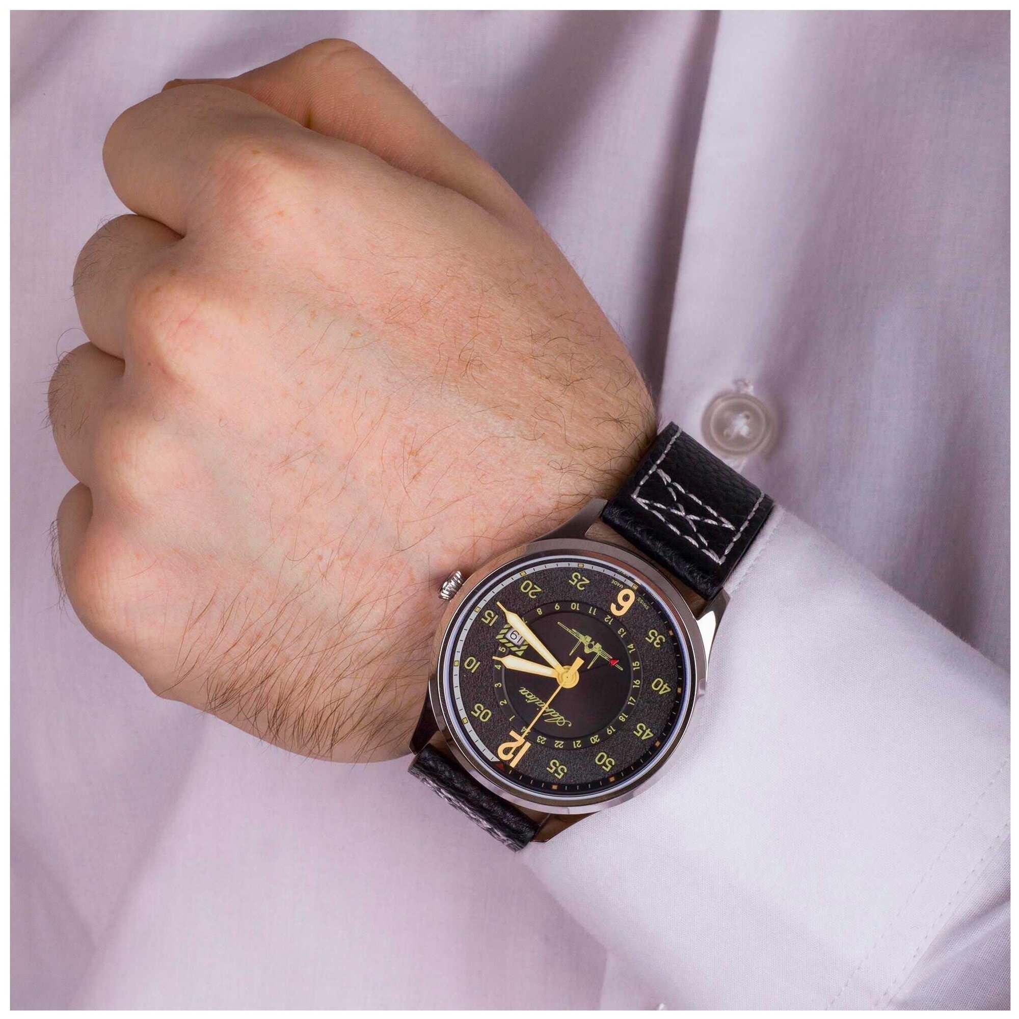 Лучшие цены. Кварцевые часы. Водостойкость WR 50. Центральные часовая, минутная и секундная стрелки. Индикация даты. Второй часовой пояс в 24х часовом формате. Стрелки и метки с люминесцентным покрытием. Черный циферблат с часовыми индексами в виде штрихов и цифр. Корпус выполнен из нержавеющей стали. Диаметр корпуса 43 мм, толщина 9мм. Устойчивое к возникновению мелких механических повреждений сапфировое стекло. Кожаный ремешок черного цвета. Магазины в вашем городе.