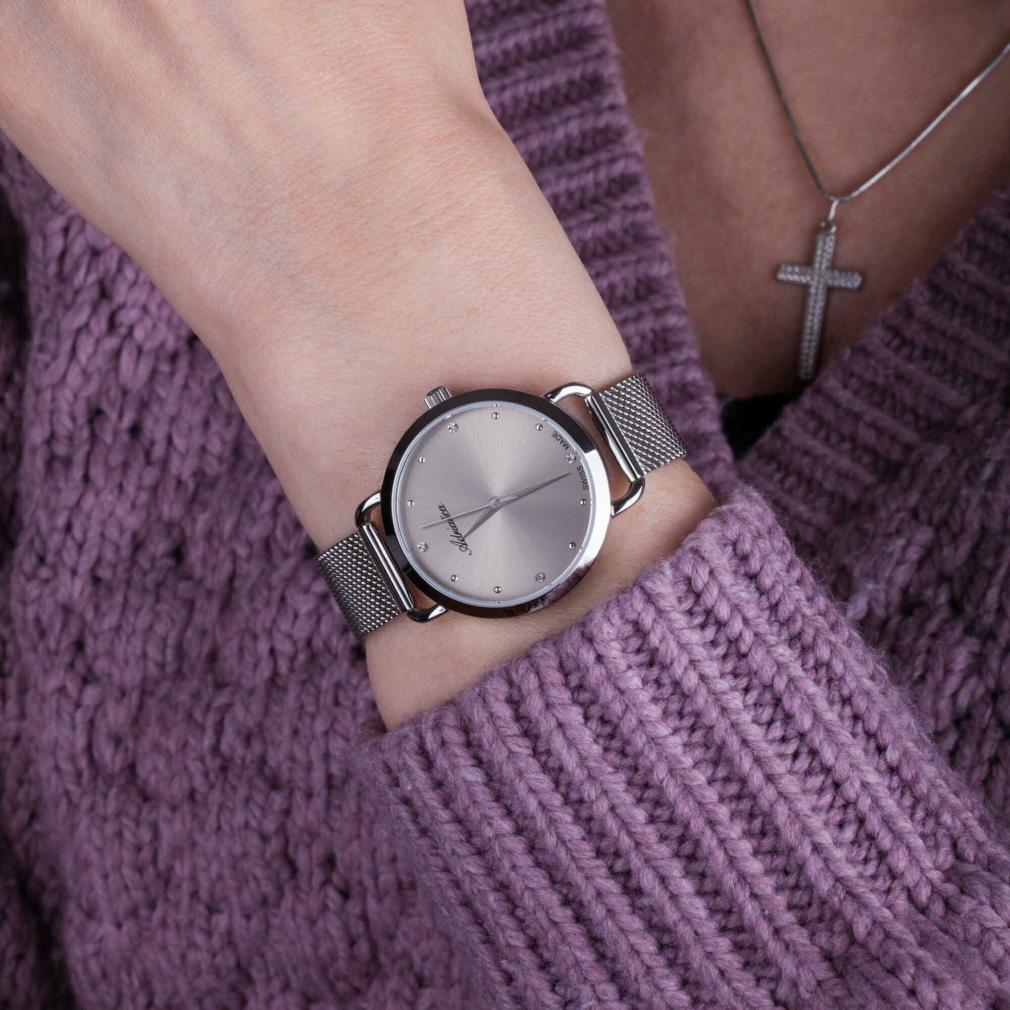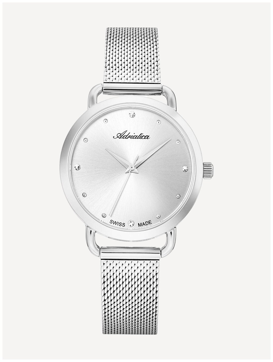 Лучшие цены. Кварцевые часы. Водостойкость WR 30. Центральные часовая, минутная и секундная стрелки. Серебристый циферблат с часовыми индексами в виде точек. Корпус выполнен из нержавеющей стали. Диаметр корпуса 33 мм, толщина 8 мм. Устойчивое к возникновению мелких механических повреждений минеральное стекло. Браслет миланского плетения, выполнен из нержавеющей стали. Часы украшены цирконами. Магазины в вашем городе.