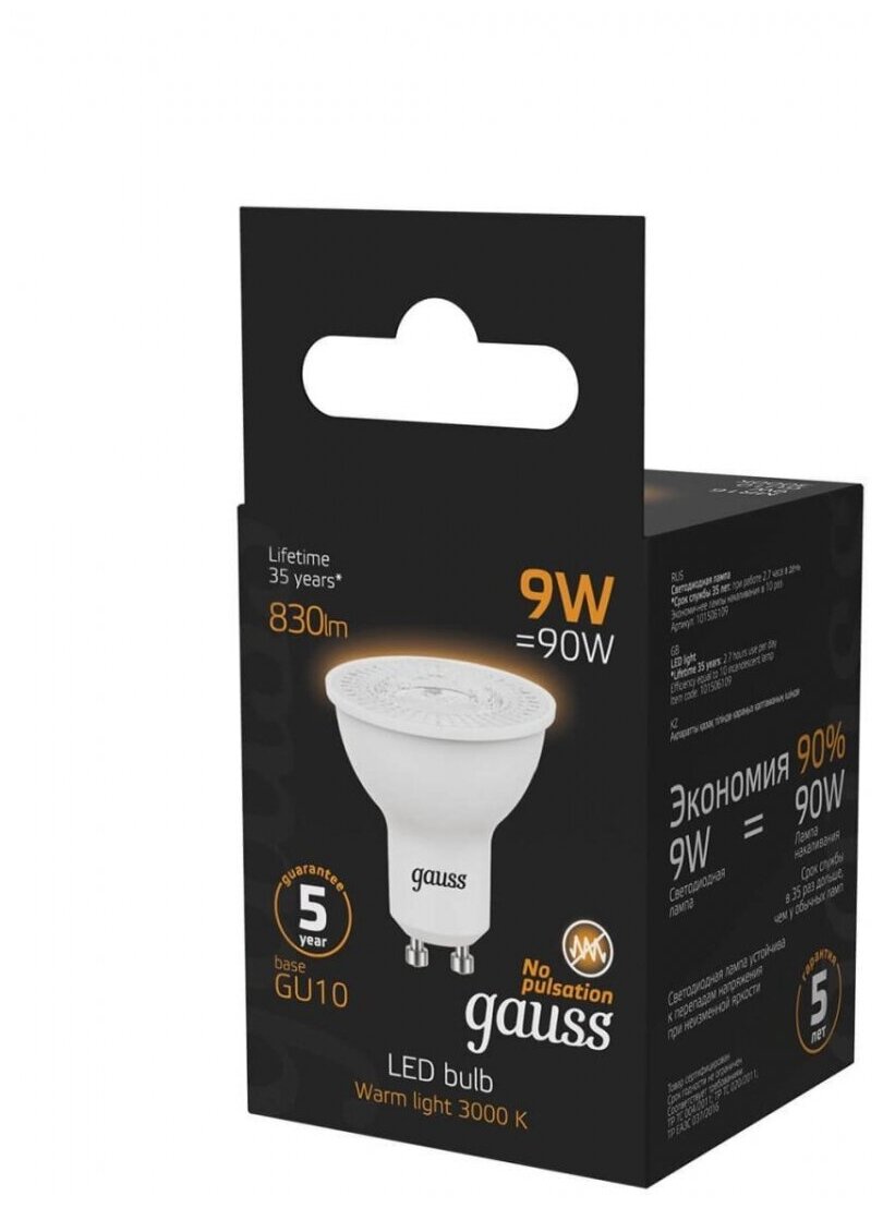 Лучшие цены. Gauss Лампа MR16 9W 830lm 3000K GU10 LED Лаконичная форма, высокий индекс цветопередачи, позволяющий создавать любые дизайнерские эффекты, а также отличные технические характеристики делают лампы Gauss серии MR16 идеальным вариантом для создания как внутреннего, так и уличного освещения. ⠀ При мощности 5 и 7 Вт данные лампы имеют высокий световой поток 500-630 Лм. Они являются лучшей альтернативой галогенным лампам, аналогам ламп накаливания 35-50 Вт. Магазины в вашем городе.
