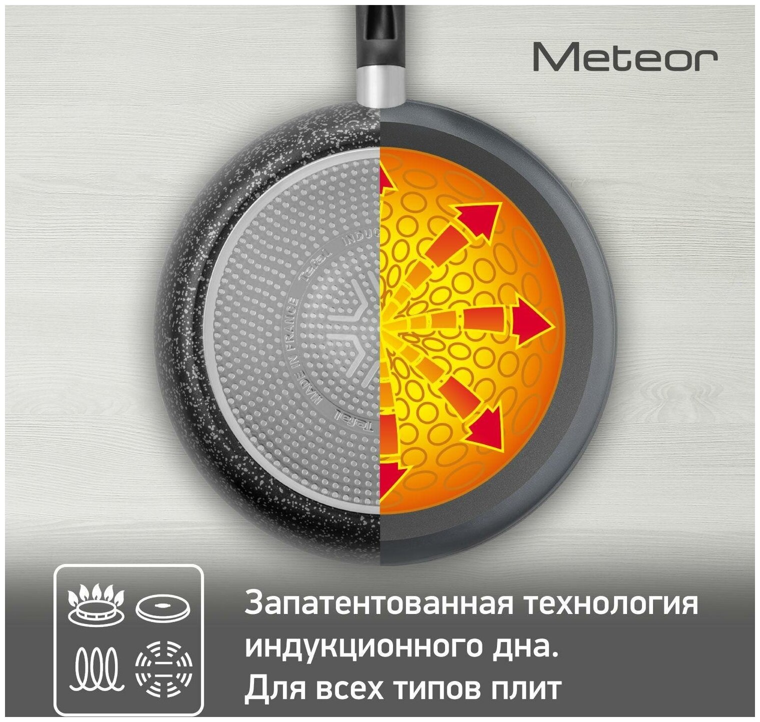 Лучшие цены. Сковорода Tefal Meteor 04208026 имеет диаметр 26 см. К ключевым особенностям можно отнести: 1) Наличие индикатора Thermo-Spot, который становится полностью красным, когда сковорода достигает идеальной температуры для начала приготовления; 2)Материал: алюминий; 3) Материал ручки: бакелит; 4) Покрытие: антипригарное Intensy; 5) Совместимо со всеми видами плит, включая индукцию; 6) Внутреннее и внешнее покрытие посуды с эффектом камня. Поставляется без крышки. Магазины в вашем городе.
