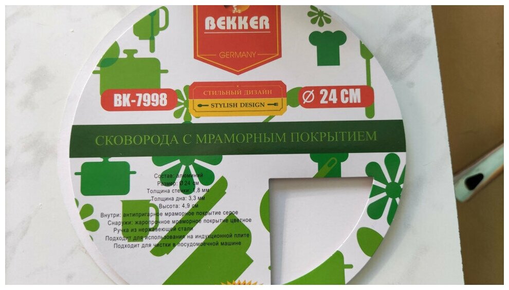 Лучшие цены. Сковорода BEKKERBK-7998 Garnet с 3-х слойныммраморным антипригарным серым покрытием снаружи и 3-х слойным жаропрочнымцветным мраморным покрытие внутри. Ручка из нержавеющей стали. Подходитдля использования на индукционной плите и в посудомоечной машине. Состав: алюминий. Характеристики: Покрытие : Антипригарное Материал : Алюминий Особенности посуды: Ненагревающиеся ручки Тип : Сковорода Бренд : Bekker Страна-изготовитель : Китай Размер крышки, см: 24 Высота стенки, см: 4. Магазины в вашем городе.