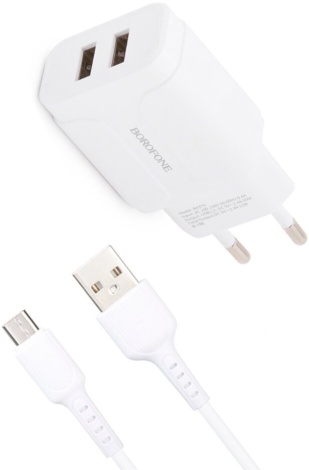 Блок питания сетевой 2 USB Borofone, BA37A, 2.4A, пластик, кабель микро USB, цвет: белый