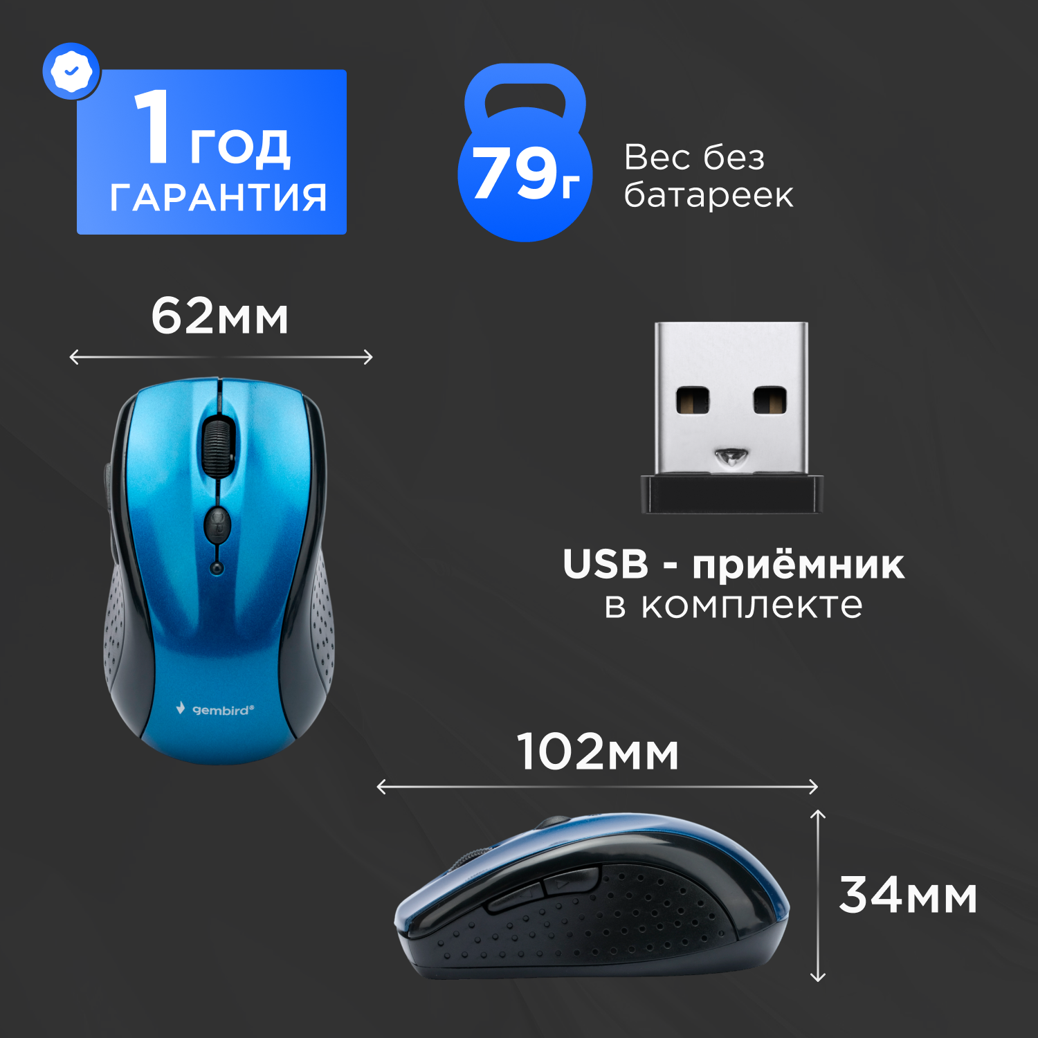 Мышь беспроводная Gembird MUSW-425, 2.4 ГГц, синий глянец, 6 кнопок, 2400DPI