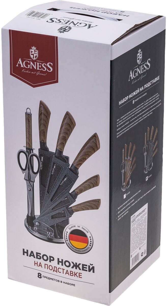 Лучшие цены. Нож - главный инструмент на кухне, а вернее ножи, т. к. даже самый лучший нож не сможет справиться со всем многообразием задач. Выбирая набор ножей AGNESS - Вы приобретаете комплект самых необходимых и чаще всего используемых ножей. Преимущества ножей AGNESS: ● Лезвие из высокоуглеродистой коррозионной стали ● Эргономичная ручка с покрытием Soft Touch для удобной нарезки ● 2-х стороняя заточка лезвия ● Удобная вращающаяся подставка ● Для экономии рабочего пространства Вы легко можете сложить подставку. Магазины в вашем городе.