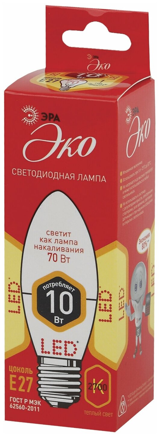 Лампа светодиодная Эра 10, 70 Вт, цоколь Е27, свеча, теплый белый, 25000 ч, Eco Led B35-10W-2700-E27