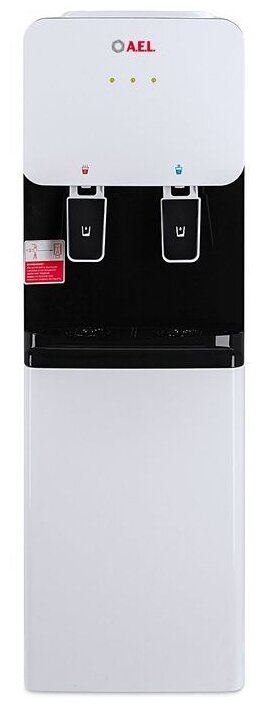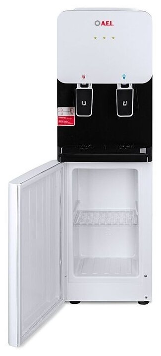 Лучшие цены. Напольный кулер для воды AEL. С верхней загрузкой бутыли и встроенным шкафчиком для посуды. С нагревом и электронным охлаждением. Потребляемая мощность 625 Вт. Тип установленных кранов: Нажим кружкой. Без защиты от ошпаривания. Цвет: Белый. Магазины в вашем городе.