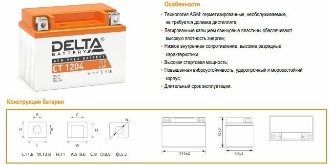 Лучшие цены. Герметизированный необслуживаемый VRLA cвинцово-кислотный стартовый Аккумулятор для мототехники Delta CT 1204 напряжением 12В и емкостью 4Ач. Обладает стартовым током в 50А. Полярность - обратная (- +). Аккумулятор для мототехники соответствует следующему коду YUASA: YB4L-B, YB4L-A, YTX4L-BS. Разработан специально для пуска двигателей мототехники. Изготовлен по технологии AGM (с микропористым заполнителем, пропитанным электролитом) из негорючего ABS пластика. Магазины в вашем городе.