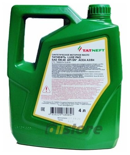 Лучшие цены. Татнефть LUXE PAO 5W-40- синтетическое моторное масло, изготовленное на основе полиальфаолефинов и эстеров с использованием многофункционального пакета присадок, предназначено для использования в высокофорсированных бензиновых и дизельных двигателях легковых автомобилей, микроавтобусов и легковых грузовиков без сажевых фильтров, отвечающих требованиям по выбросам токсичных компонентов Евро-5. Магазины в вашем городе.