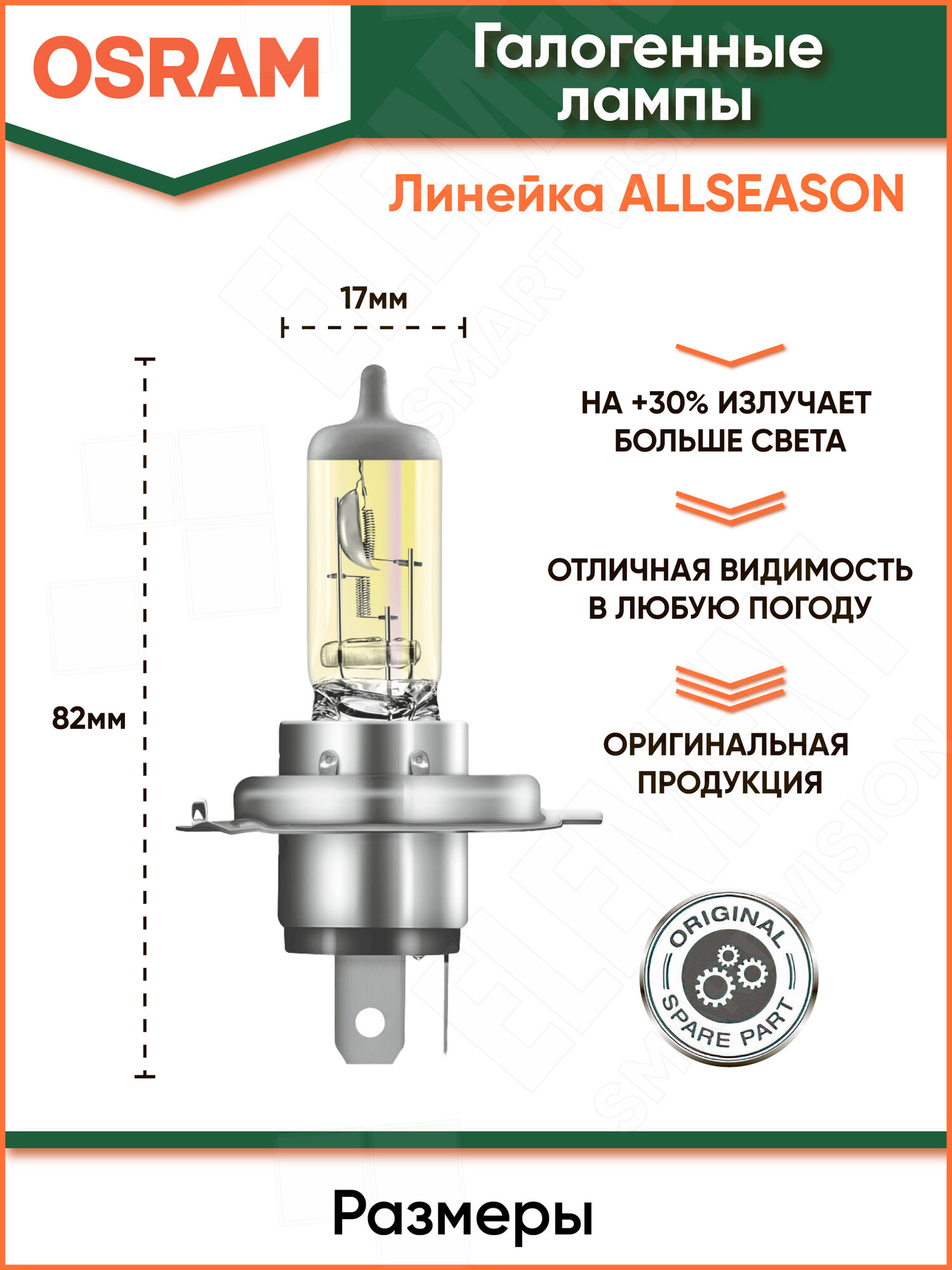 Лампа H4 12V 60/55W P43t Allseason +30% Больше Света, Цветовая Температура 3000К 1 Шт. Osram арт. 64193ALS