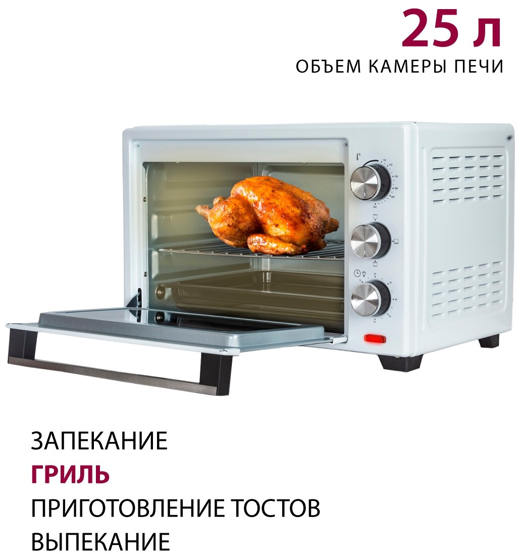 Мини-печь Pioneer 25 литров с грилем, регулировкой температуры, 3 режима нагрева / Печка с двойным жаропрочным стеклом / Электропечь / Печь духовка