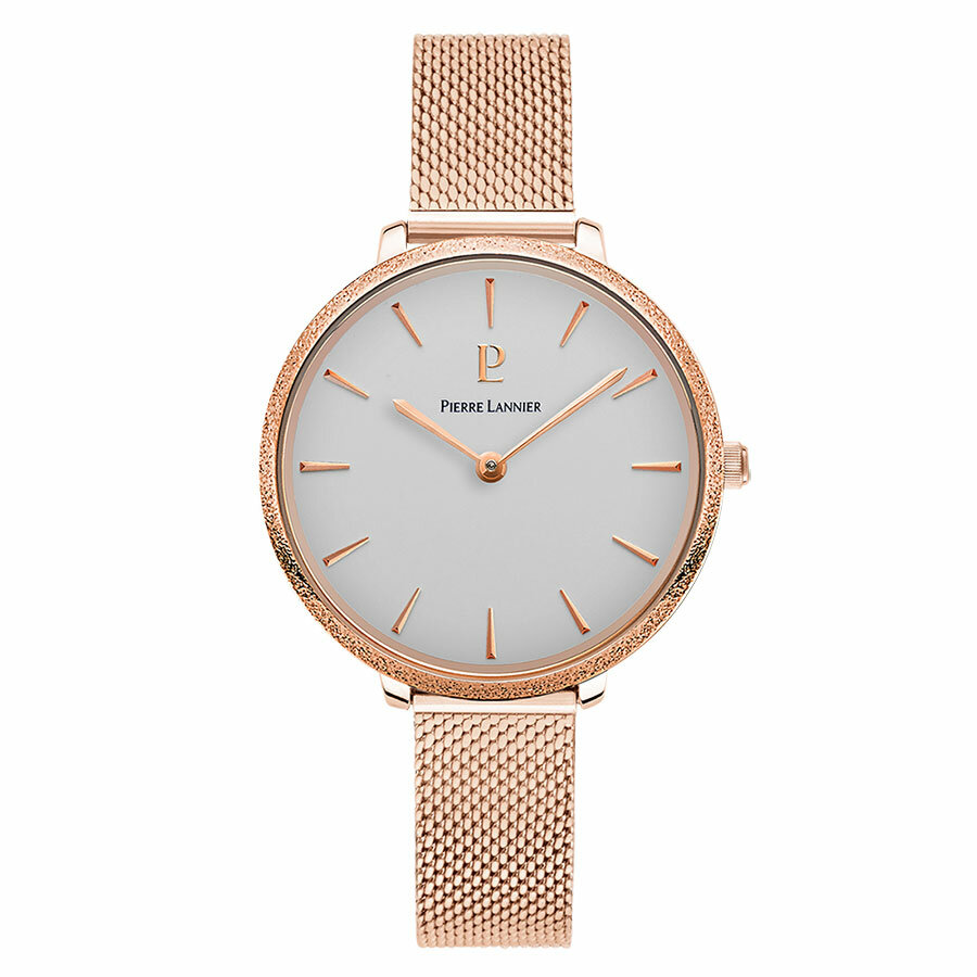 Лучшие цены. Женские кварцевые часы. Центральные часовая и минутная стрелки. Белый циферблат. Круглый корпус выполнен из полированной нержавеющей стали с IP покрытием цвета розового золота. Диаметр корпуса составляет 33 мм, толщина 6,8 мм. Стальной браслет с покрытием шириной 12 мм выполнен в технике миланского плетения, раскладная застежка. Прочное минеральное стекло устойчивое к мелким механическим повреждениям. Водостойкость WR 30 (брызги). Магазины в вашем городе.
