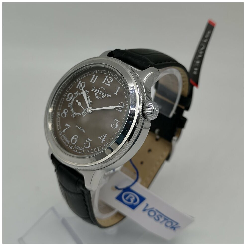 Лучшие цены. Мужские российские механические наручные часы Восток Ретро 550934 К-55 с автоподзаводом. Пружинный механизм с точностью +60/- 20 сек в сутки. Отображение времени в часовом формате 12/24. Секундная стрелка вынесена на отдельный циферблат. В механизме рубиновых камней - 31. Запас хода 31 час. Противоударное устройство оси баланса от небольших механических воздействий. Стрелки часов покрыты безопасным люминесцентным покрытием, которое светится в темноте. Магазины в вашем городе.