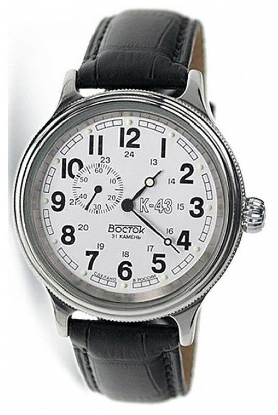 Лучшие цены. Мужские российские механические наручные часы Восток 540932 К-43 с автоподзаводом. Оригинальный дизайн циферблата. Пружинный механизм с точностью +60/- 20 сек в сутки. Отображение времени в часовом формате 12/24. Секундная стрелка вынесена на отдельный циферблат. В механизме рубиновых камней - 31. Запас хода 31 час. Противоударное устройство оси баланса от небольших механических воздействий. Стрелки часов покрыты безопасным люминесцентным покрытием, которое светится в темноте. Магазины в вашем городе.
