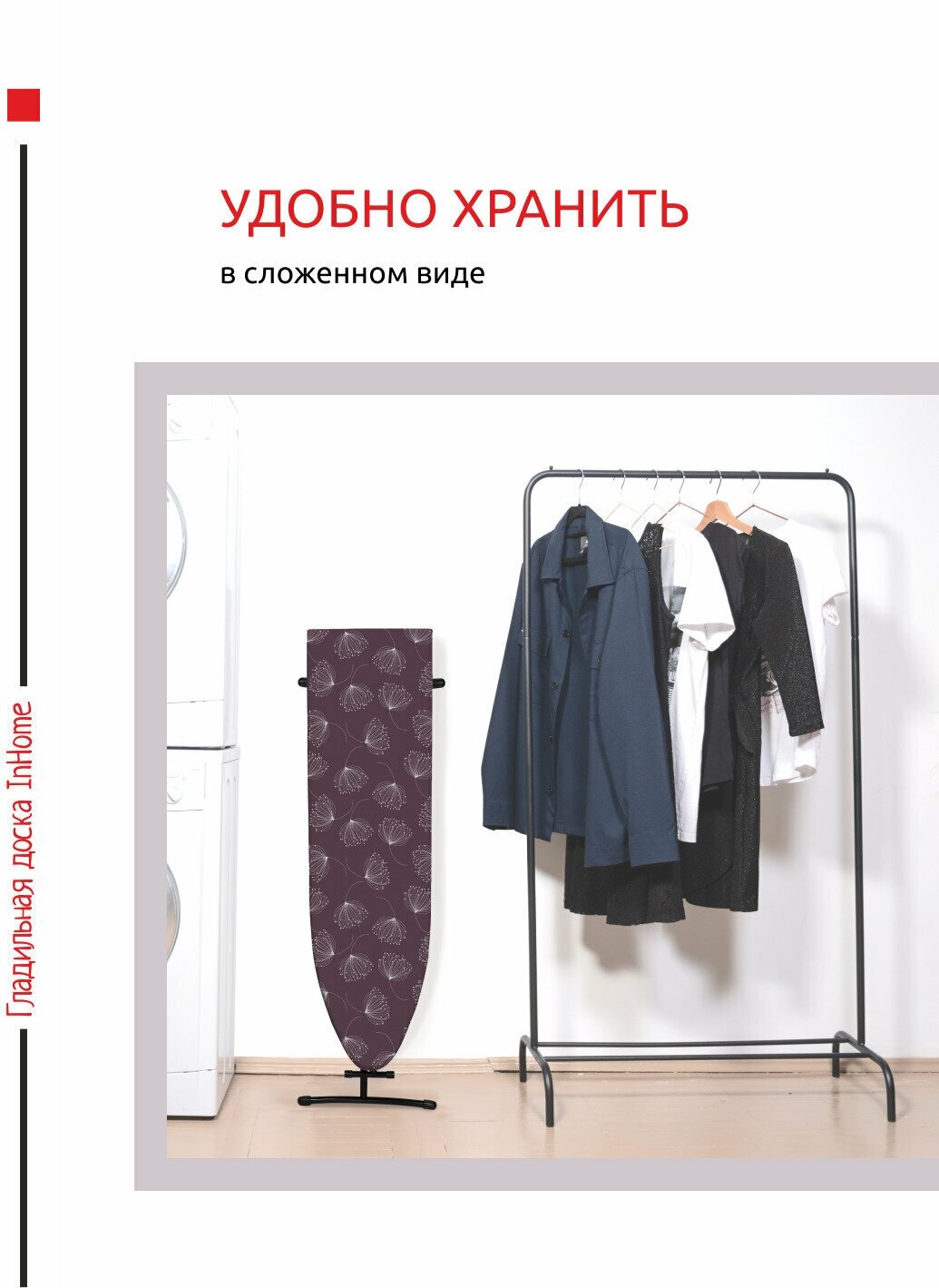Лучшие цены. Гладильная доска InHome Lina отлично подходит для ежедневного использования! Она лаконичная и компактная, занимает совсем немного места! Основа гладильной доски из ДСП: она легкая и идеально ровная, что позволяет утюгу скользить по одежде и разглаживать даже самые тонкие ткани! Выдвижная подставка для утюга будет удобна как для правшей, так и для левшей. 2 уровня высоты гладильной поверхности – 70 и 80 см от уровня пола – можете установить наиболее комфортную для вас высоту. Магазины в вашем городе.