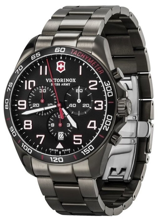 Лучшие цены. Особенности: Мужской кварцевый хронограф. Центральные часовая и минутная стрелки, секундная стрелка вынесена на малый циферблат. Апертура даты в позиции 6 часов. Секундомер. Тахиметр. Черный циферблат. Арабская индикация времени. Люминесцентные стрелки и метки. Круглый корпус выполнен из полированной нержавеющей стали с PVD покрытием цвета оружейной стали. Диаметр корпуса составляет 42 мм, толщина 11 мм. Заводная головка с защитой. Стальной браслет с покрытием шириной 21 мм, раскладывающаяся застежка. Магазины в вашем городе.