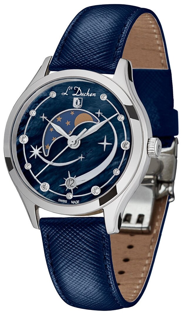 Лучшие цены. Часы наручные L'Duchen D 837.13.47. По задумке дизайнеров на синем циферблате часов мы можем наблюдать завораживающее космическое явление: метеорный поток Персеиды. Падающие «звезды» присутствуют в виде фианитов разного размера и накладных элементов из стали. В верхней части циферблата из натурального перламутра расположен индикатор фаз луны, который элегантно декорирован металлической рамкой. На шести часах размещен указатель даты, оформленный в виде звезды. Магазины в вашем городе.