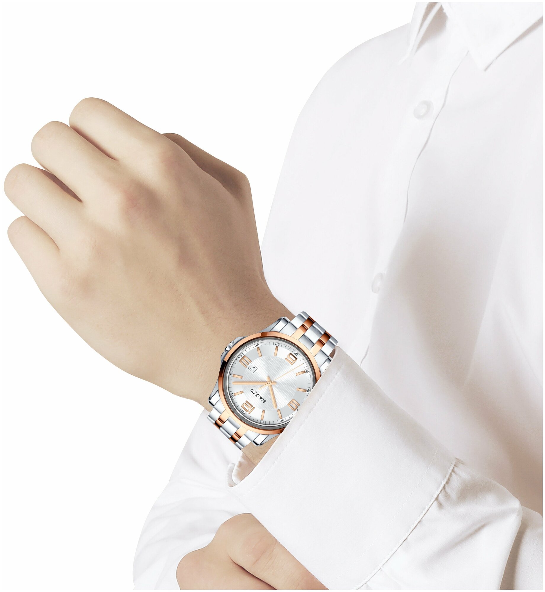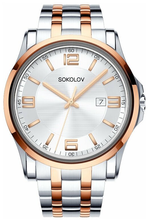 Лучшие цены. Мужские наручные часы SOKOLOV, выполнены из прочной гипоаллергенной стали, стекло минеральное, механизм кварцевый Miyota (CITIZEN) Япония, функции часы, минуты, секунды, дата. Цвет циферблата серебристый. Покрытие IP Rose Gold. Диаметр корпуса 45 мм. Браслет стальной, застежка бабочка. Уровень герметизации - 5 АТМ. Стиль Casual. Магазины в вашем городе.