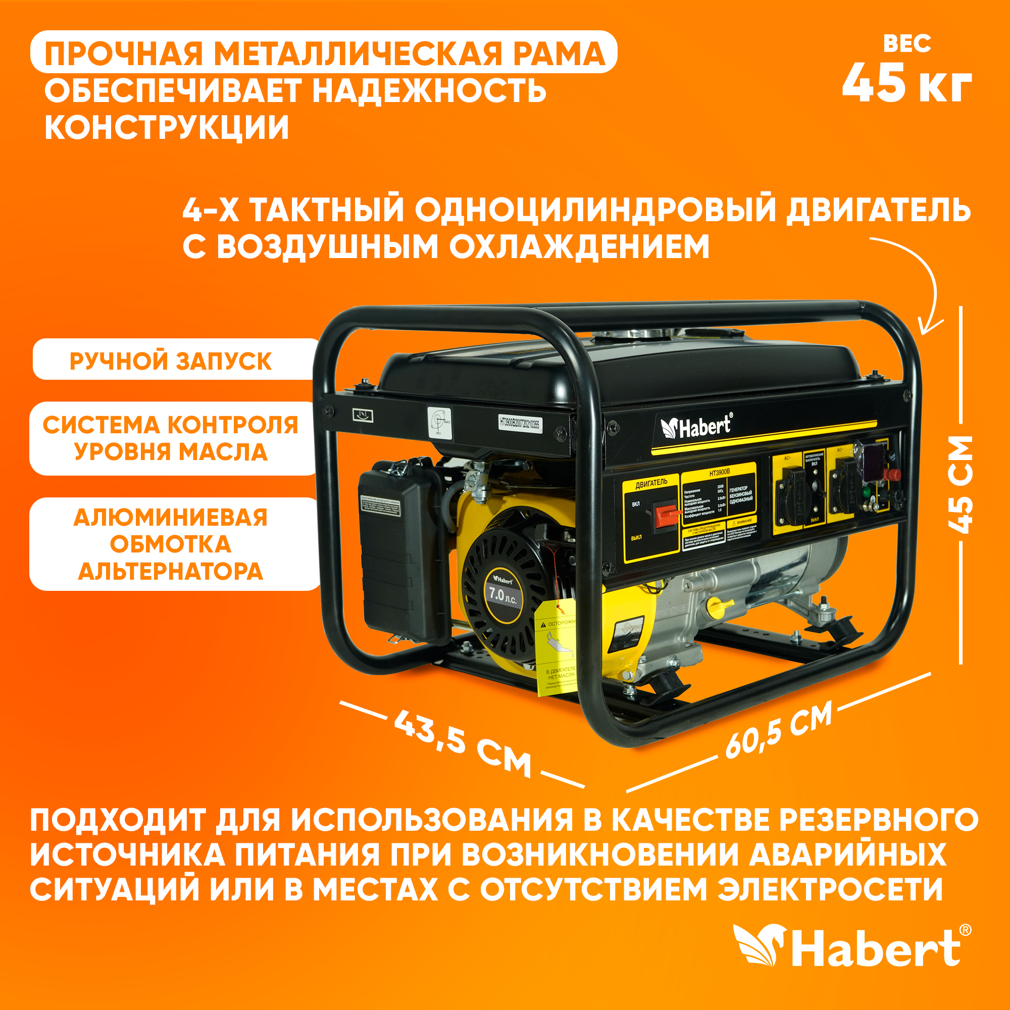 Электрогенератор Генератор бензиновый однофазный Habert HT3900B 3кВт 220В бак 15л