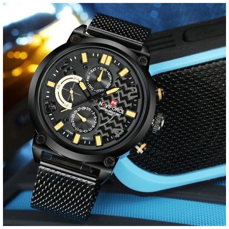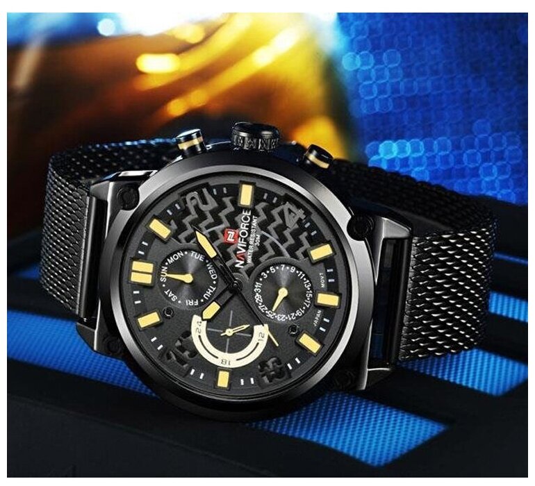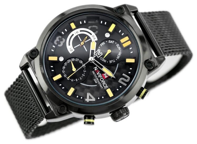 Лучшие цены. Naviforce NF9068S (B/Y/B) - стильные мужские часы, выполненные в классическом стиле, но с элементами hi-tech на циферблате. Корпус из цинкового сплава отлично сочетается с ремешком из нержавеющей стали выполненный в виде миланского плетения. На циферблате имеется три мини-циферблата показывающих текущее число, день недели, а также часовой хронограф, где 1 круг - это сутки. Особенности часов Naviforce NF9068S (B/Y/B). Магазины в вашем городе.