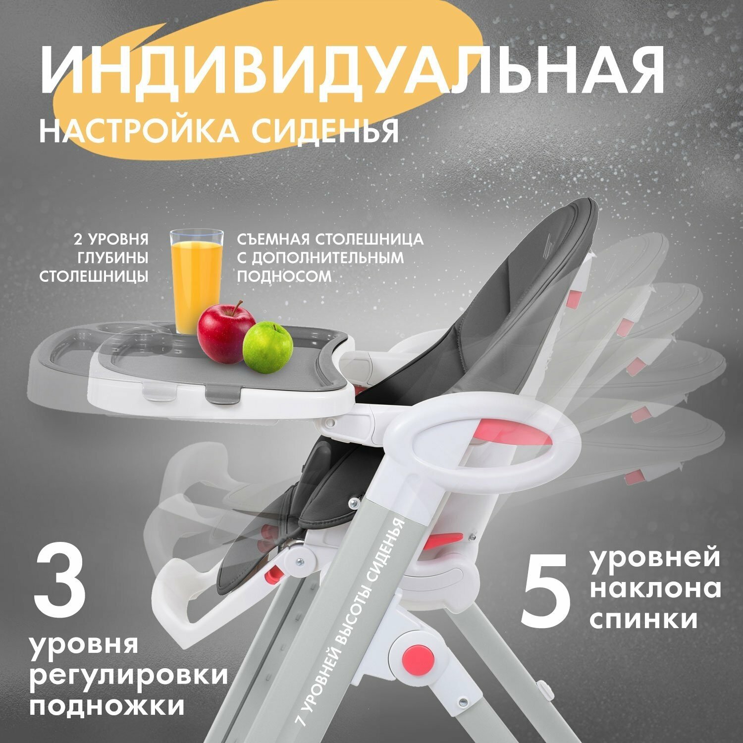 | Дополнительно | съемный столик / съемный поднос / столешница с бортиком / ремни безопасности / колеса с фиксаторами |