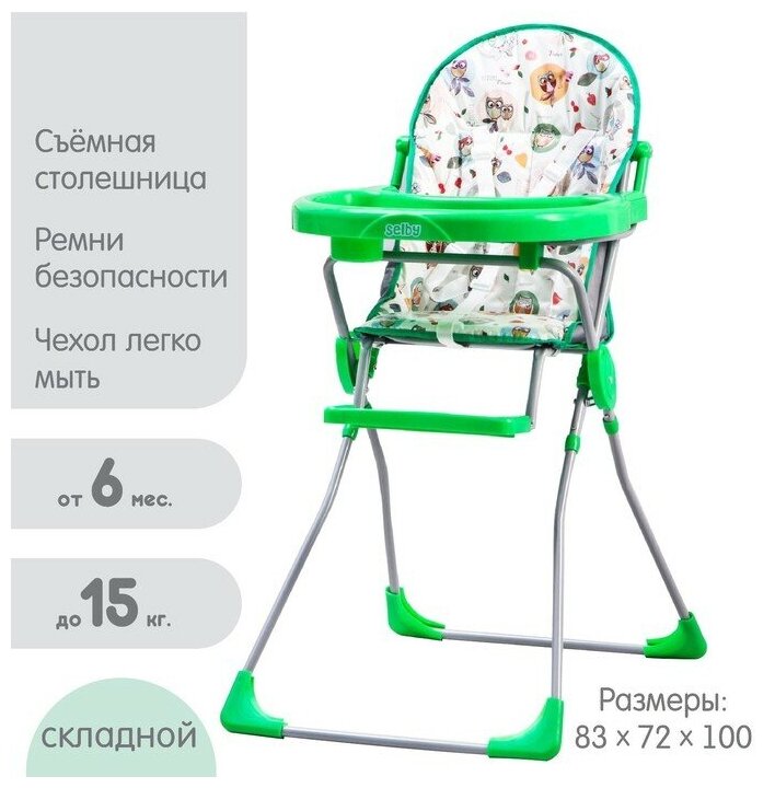 Лучшие цены. Стульчик для кормления Selby 152 «Совы», цвет зелёный Длина, мм|740; Глубина, мм|720; Высота, мм|1000; Вес, кг|5.55; Maксимальная нагрузка, кг|15; Материал корпуса|Металл; Регулируемая спинка|Нет; Материал|Пластик; Материал|Металл; Материал|Текстиль; Съёмный чехол|Да; Особенность|Складной; Особенность|Для кормления; Съёмный столик|Да; Размер посадочного места, мм|260 х 320. Магазины в вашем городе.