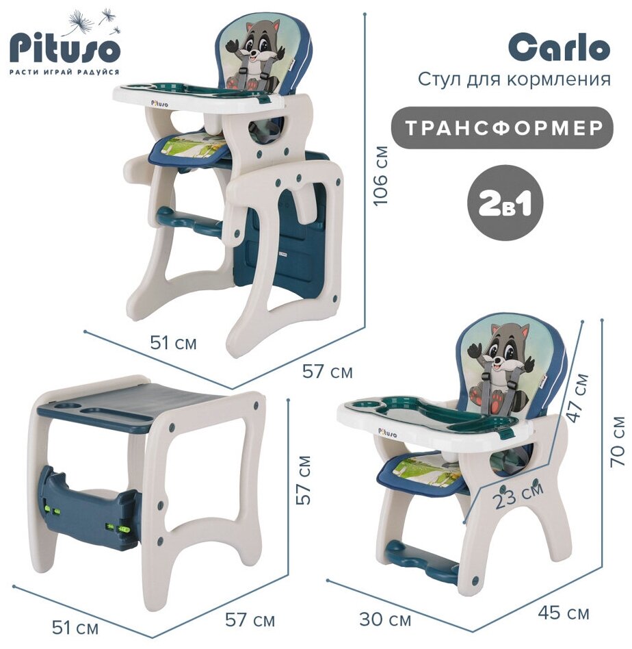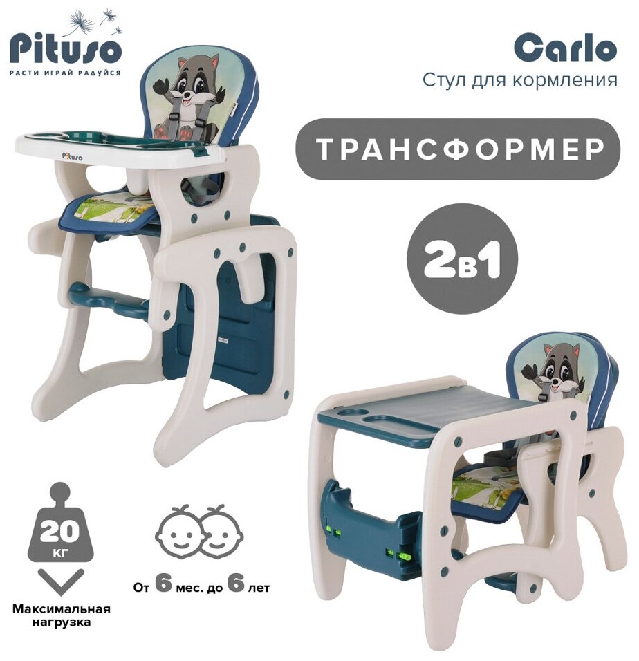 Лучшие цены. Стул-трансформер Carlo PITUSO Стульчик для кормления представляет собой идеальную конструкцию 2 в 1. Изначально его можно использовать для кормления малыша, с регулируемой спинкой в 3-х положениях и столиком, регулируемым по глубине посадки, который имеет съемный подносик. А затем, когда малыш подрастет, и в качестве стула с партой. Многофункциональность такого стульчика-трансформера позволяет экономить свободное пространство в помещении. Магазины в вашем городе.