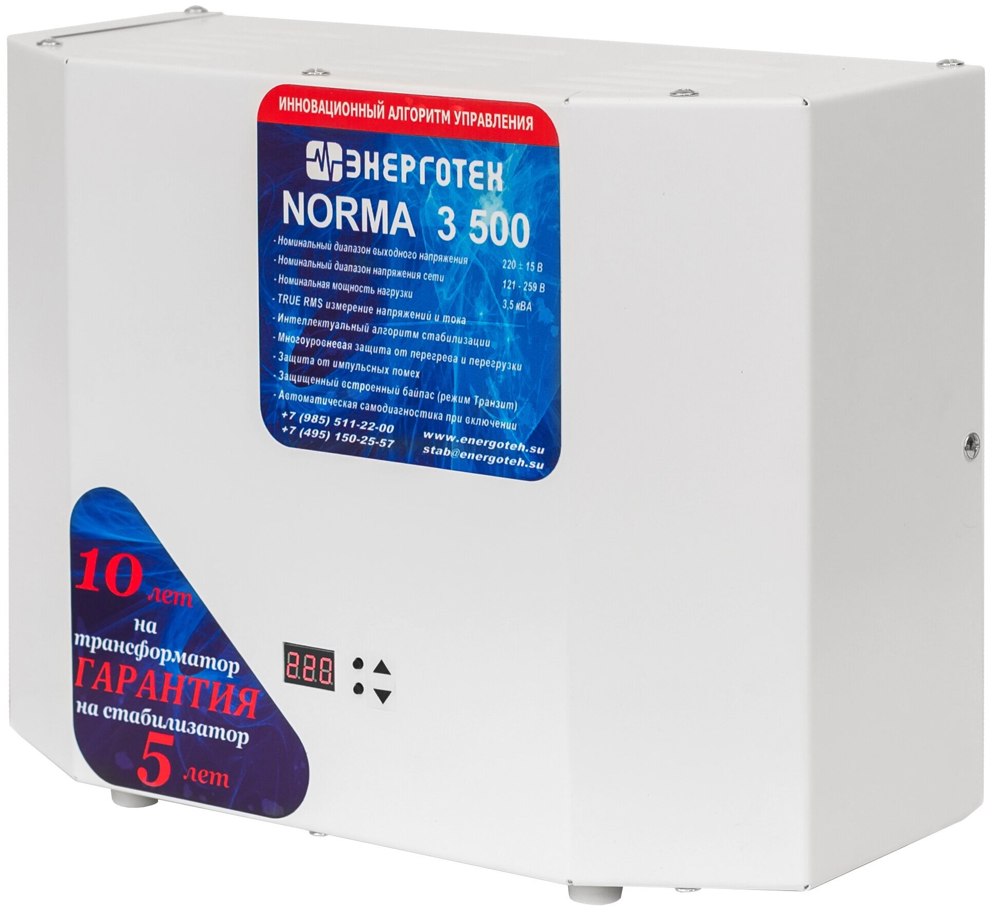 Лучшие цены. Однофазный стабилизатор переменного напряжения Энерготех NORMA 3500 предназначен для надежной защиты подключенного к стабилизатору электрооборудования пользователя от искажений и/или перепадов сетевого напряжения. Обеспечивает стабильную и безотказную работу домашней аппаратуры и электроприборов. Стабилизаторы предназначены для работы в однофазных сетях с напряжением синусоидальной формы с номинальным значением 220 В и частотой 50 Гц. Магазины в вашем городе.