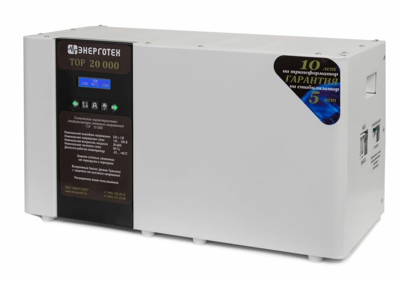 Лучшие цены. Энерготех TOP 20000, однофазный, мощность: 20 кВА (16 кВт). диапазон вх.: 125...305 В; точность: ±1,5 %. Электронный, автономен, бесшумен, не требует ухода и обслуживания, самодиагностика, автозапуск, защита от: перегрузки, короткого замыкания, входного перенапряжения. Магазины в вашем городе.