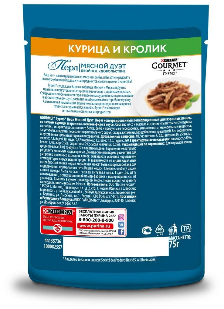 Влажный корм Gourmet Перл Мясной Дуэт с курицей и кроликом в соусе 75г 13 шт
