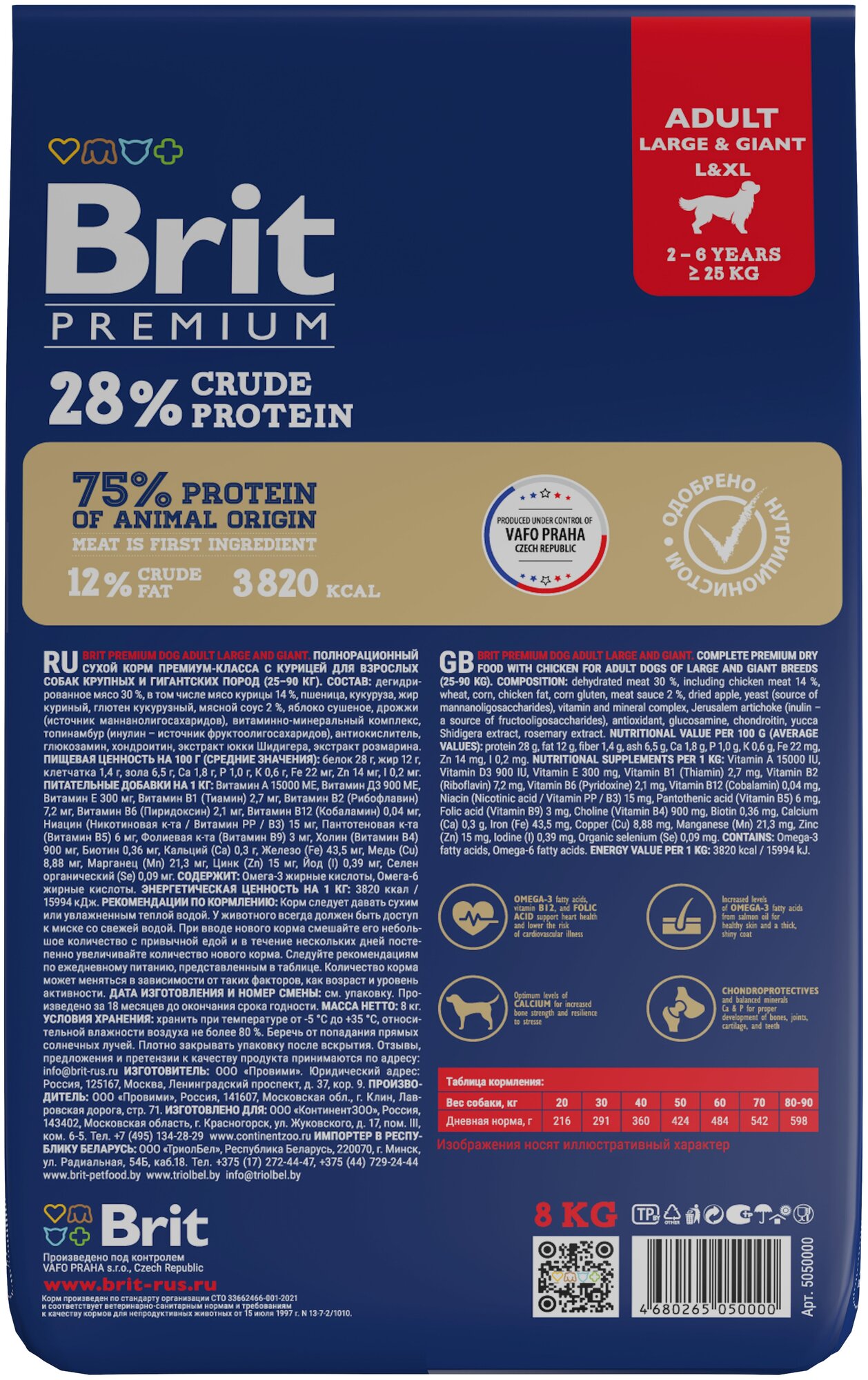 Сухой корм BRIT PREMIUM DOG ADULT LARGE & GIANT для взрослых собак крупных и гигантских пород с курицей (8 кг)