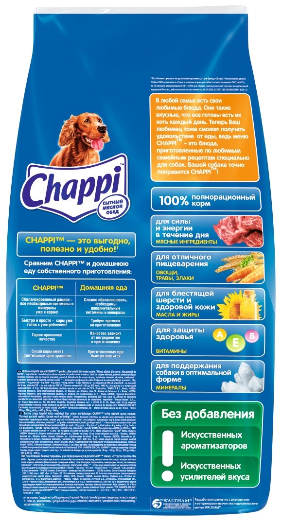 Лучшие цены. В Chappi есть все необходимые для собаки белки, жиры и углеводы, а также полезные витамины и минералы. Готовый рацион Chappi содержит натуральные и полезные ингредиенты, приправу из овощей и трав — морковь и люцерну. Магазины в вашем городе.