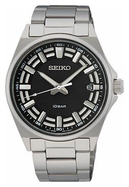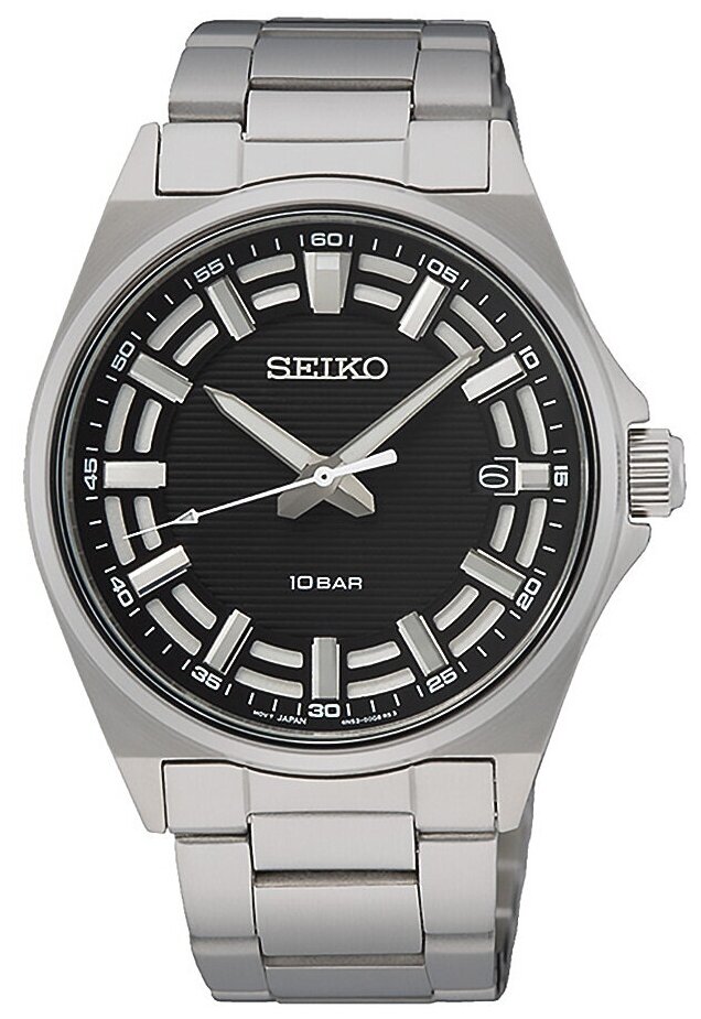 Лучшие цены. Мужские кварцевые часы. Калибр механизма 6N52. Центральные часовая, минутная и секундная стрелки. Апертура даты в позиции 3 часов. Черный циферблат. Круглый корпус выполнен из нержавеющей стали. Диаметр корпуса составляет 40 мм, толщина 9,8 мм. Заводная головка с защитой. Стальной браслет, тройная раскладывающаяся застежка. Закаленное минеральное стекло Hardlex устойчивое к мелким механическим повреждениям. Водостойкость WR 100 (плавание без погружения). Вес примерно 135 гр. Магазины в вашем городе.