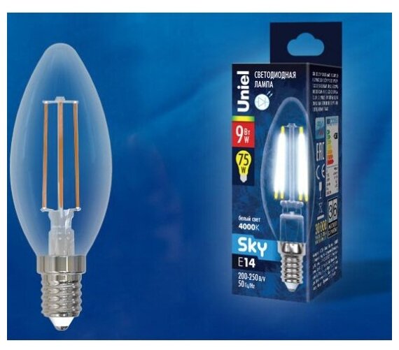 Светодиодная лампа Uniel LED-C35-9W/4000K/E14/CL PLS02WH Форма "свеча", прозрачная. Серия Sky. Белый свет (4000К). Картон. ТМ .